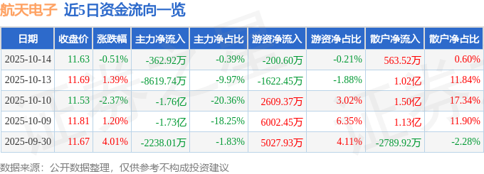 证券之星消息,截至2025年10月14日收盘,航天电子(600879)报收于11.63元,下跌0.51%,换手率2.41%,成交量79.43万手,成交额9.38亿元。
