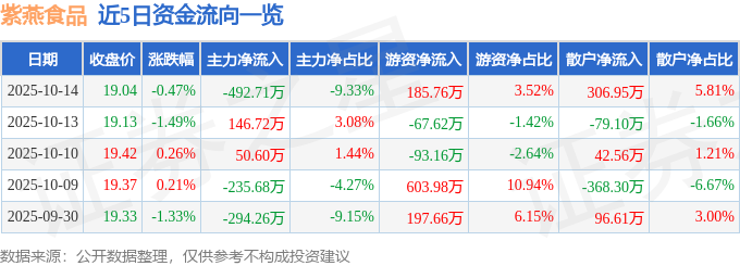 证券之星消息,截至2025年10月14日收盘,紫燕食品(603057)报收于19.04元,下跌0.47%,换手率0.67%,成交量2.76万手,成交额5279.35万元。