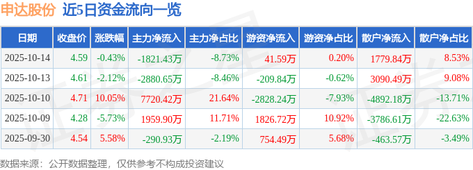 证券之星消息,截至2025年10月14日收盘,申达股份(600626)报收于4.59元,下跌0.43%,换手率4.05%,成交量44.84万手,成交额2.09亿元。