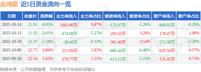 证券之星消息,截至2025年10月14日收盘,金鸿顺(603922)报收于21.91元,下跌0.05%,换手率2.66%,成交量4.78万手,成交额1.06亿元。