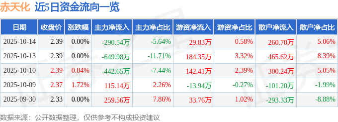 证券之星消息,截至2025年10月14日收盘,赤天化(600227)报收于2.39元,上涨0.0%,换手率1.67%,成交量21.39万手,成交额5152.99万元。