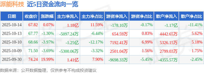 证券之星消息,截至2025年10月14日收盘,派能科技(688063)报收于67.82元,上涨0.07%,换手率6.0%,成交量14.72万手,成交额10.22亿元。