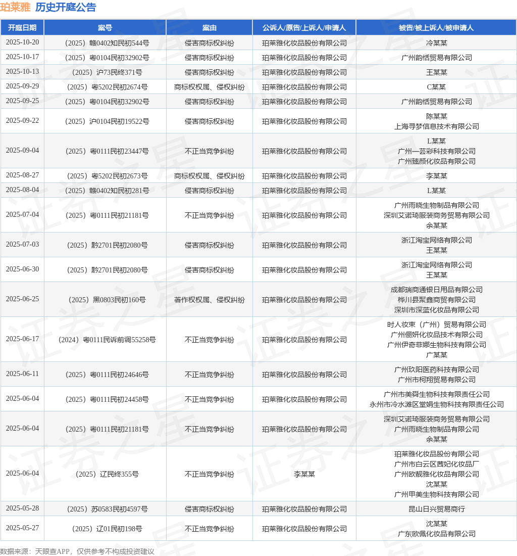 案号:(2025)粤0104民初32902号根据统计,近一年内以珀莱雅化妆品股份有限公司为当事人的历史开庭公告有49则,其中案由为“侵害商标权纠纷”的公告以29则居首,其次为“不正当竞争纠纷”有15则,“商标权权属、侵权纠纷”有2则。历史开庭公告(前20条)如下: