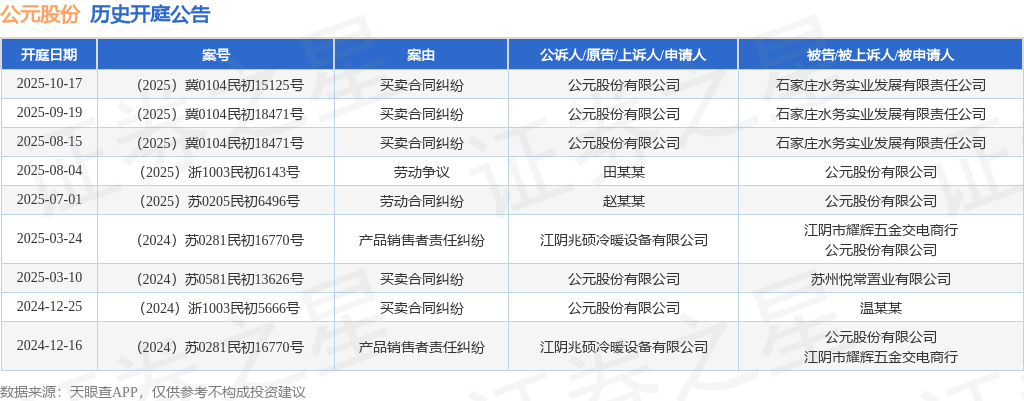 根据统计,近一年内以公元股份有限公司为当事人的历史开庭公告有9则,其中案由为“买卖合同纠纷”的公告以5则居首,其次为“产品销售者责任纠纷”有2则,“劳动争议”有1则。历史开庭公告如下: