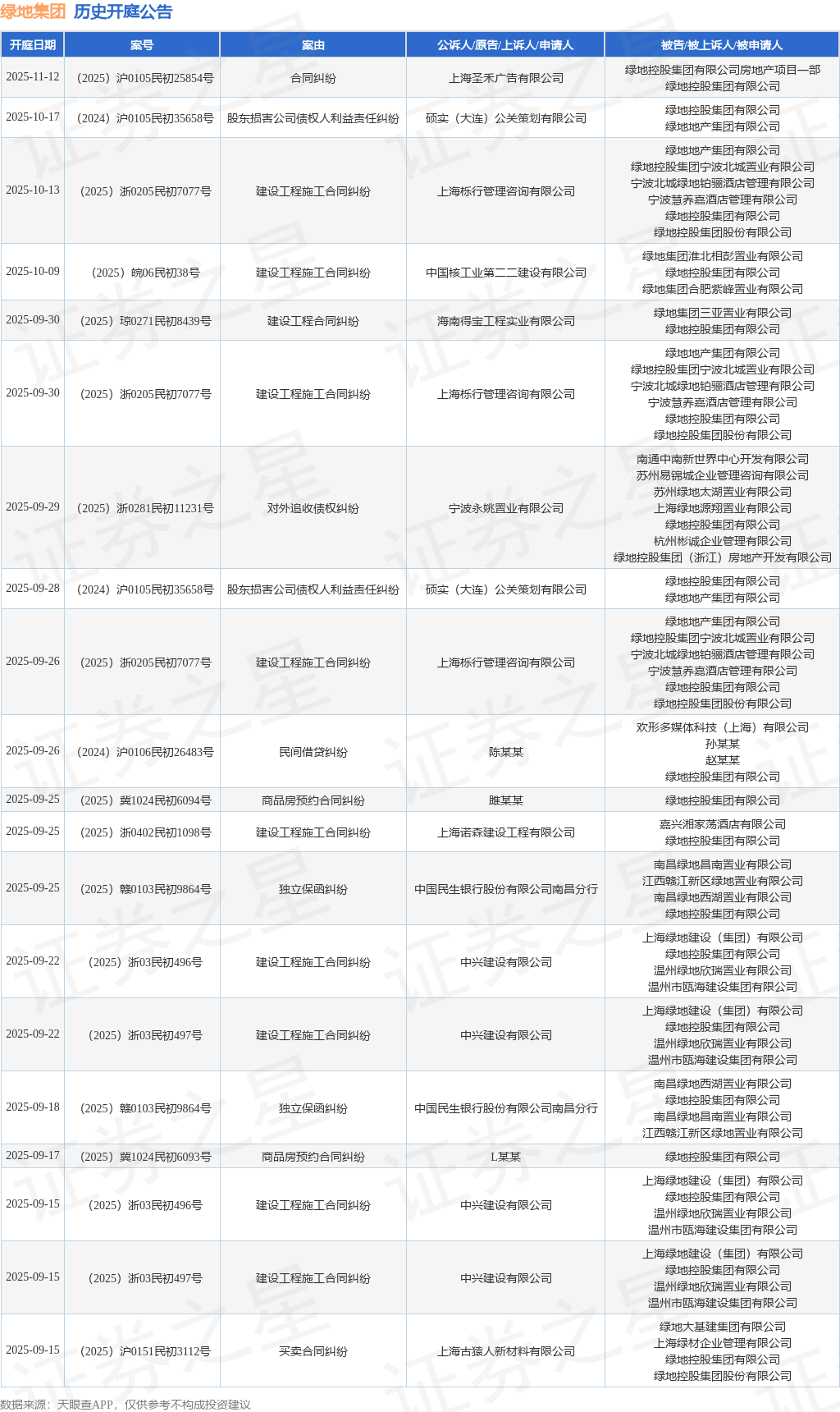 案号:(2024)沪0105民初35658号根据统计,近一年内以绿地控股集团有限公司为当事人的历史开庭公告有203则,其中案由为“建设工程施工合同纠纷”的公告以36则居首,其次为“金融借款合同纠纷”有24则,“合同纠纷”有19则。历史开庭公告(前20条)如下: