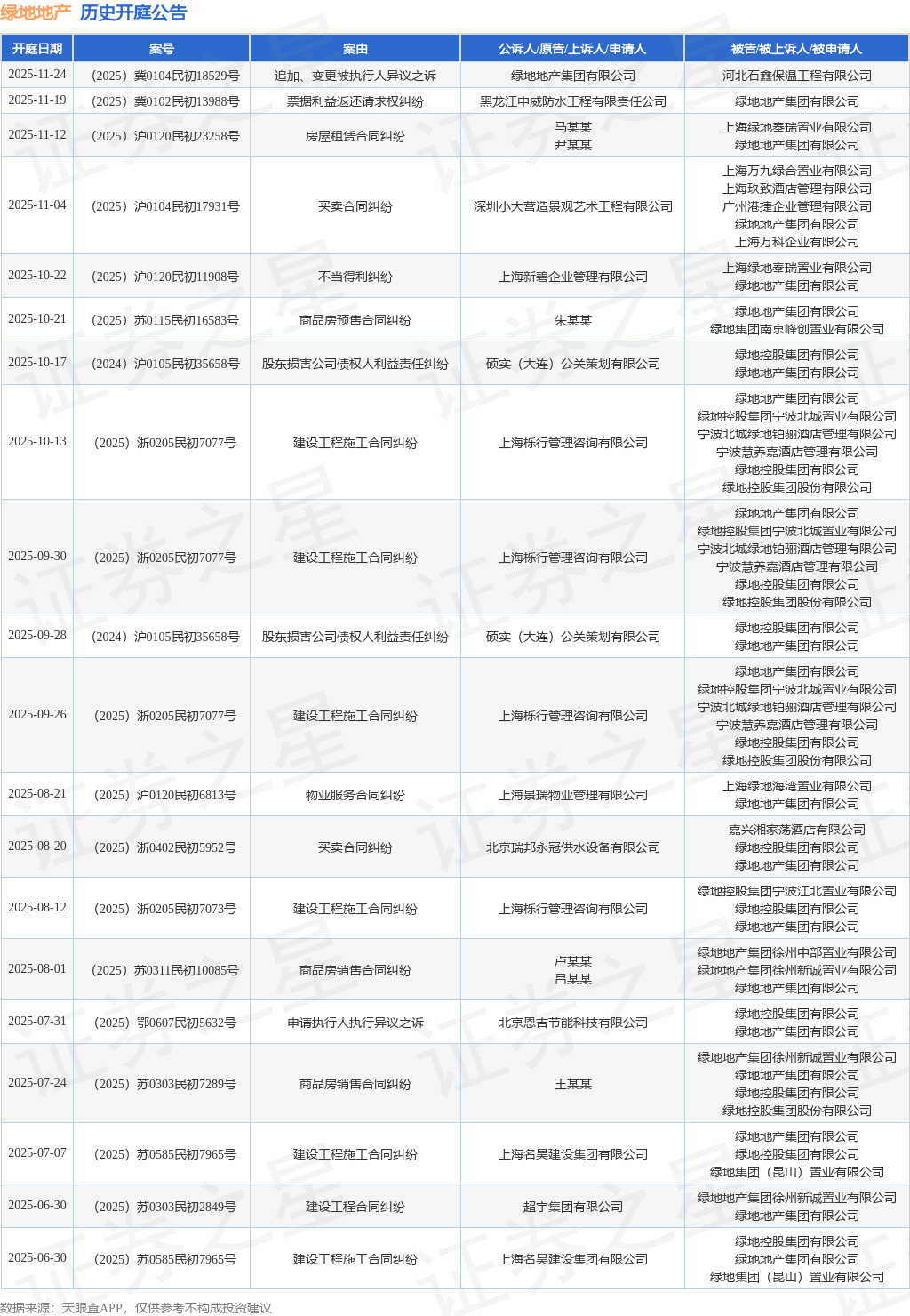 案号:(2024)沪0105民初35658号根据统计,近一年内以绿地地产集团有限公司为当事人的历史开庭公告有103则,其中案由为“建设工程施工合同纠纷”的公告以20则居首,其次为“建设工程合同纠纷”有16则,“金融借款合同纠纷”有15则。历史开庭公告(前20条)如下: