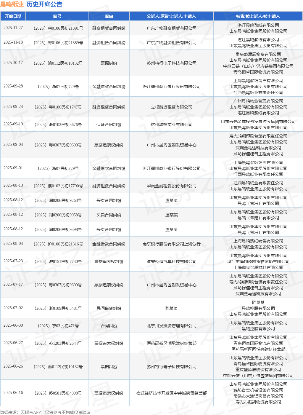 案号:(2025)渝0112民初10132号根据统计,近一年内以山东晨鸣纸业集团股份有限公司为当事人的历史开庭公告有82则,其中案由为“票据追索权纠纷”的公告以19则居首,其次为“融资租赁合同纠纷”有17则,“买卖合同纠纷”有11则。历史开庭公告(前20条)如下: