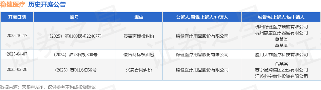 根据统计,近一年内以稳健医疗用品股份有限公司为当事人的历史开庭公告有3则,其中案由为“侵害商标权纠纷”的公告以2则居首,其次为“买卖合同纠纷”有1则。历史开庭公告如下: