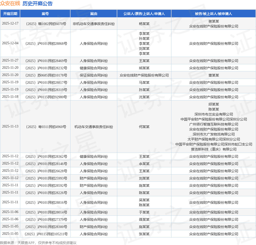 证券之星消息,根据天眼查APP显示,近日公布了一则众安在线财产保险股份有限公司作为被告/被上诉人的开庭公告,详细内容如下:
