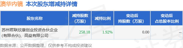 证券之星消息,10月14日澳华内镜发布公告《澳华内镜:股东减持股份结果公告》,其股东苏州君联欣康创业投资合伙企业(有限合伙)、高燊有限公司于2025年7月23日至2025年10月13日间合计减持258.18万股,占公司目前总股本的1.9172%,变动期间该股股价上涨4.76%,截止10月13日收盘报51.08元。