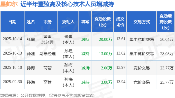 星帅尔近半年内的董监高及核心技术人员增减持详情如下: