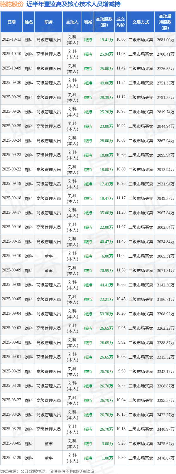 骆驼股份近半年内的董监高及核心技术人员增减持详情如下: