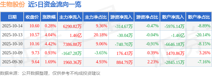 证券之星消息,截至2025年10月14日收盘,生物股份(600201)报收于10.6元,上涨0.28%,换手率5.61%,成交量62.42万手,成交额6.72亿元。
