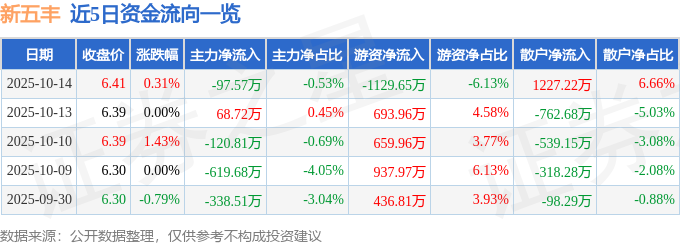 证券之星消息,截至2025年10月14日收盘,新五丰(600975)报收于6.41元,上涨0.31%,换手率2.83%,成交量28.75万手,成交额1.84亿元。
