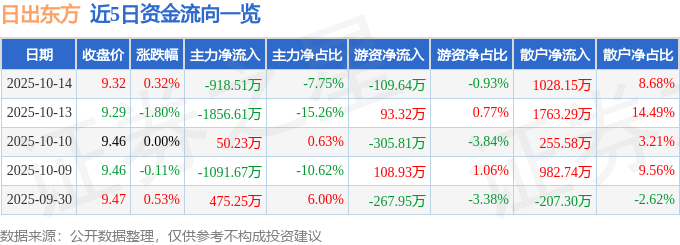 证券之星消息,截至2025年10月14日收盘,日出东方(603366)报收于9.32元,上涨0.32%,换手率1.56%,成交量12.65万手,成交额1.18亿元。