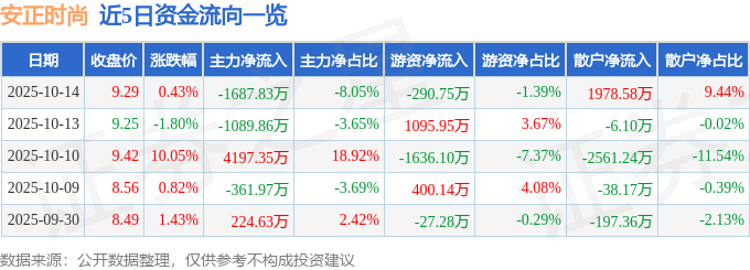 证券之星消息,截至2025年10月14日收盘,安正时尚(603839)报收于9.29元,上涨0.43%,换手率5.77%,成交量22.46万手,成交额2.1亿元。