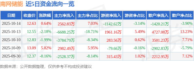 证券之星消息,截至2025年10月14日收盘,南网储能(600995)报收于12.63元,上涨0.64%,换手率0.9%,成交量28.65万手,成交额3.64亿元。