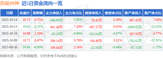 证券之星消息,截至2025年10月14日收盘,苏盐井神(603299)报收于10.73元,上涨0.75%,换手率0.77%,成交量5.96万手,成交额6377.92万元。