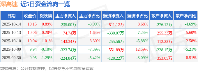 证券之星消息,截至2025年10月14日收盘,深高速(600548)报收于10.15元,上涨0.89%,换手率0.34%,成交量5.84万手,成交额5891.15万元。