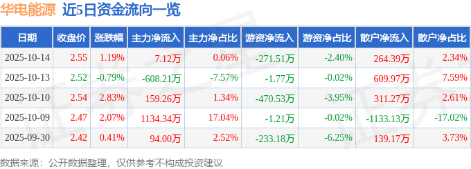 证券之星消息,截至2025年10月14日收盘,华电能源(600726)报收于2.55元,上涨1.19%,换手率1.62%,成交量44.42万手,成交额1.13亿元。