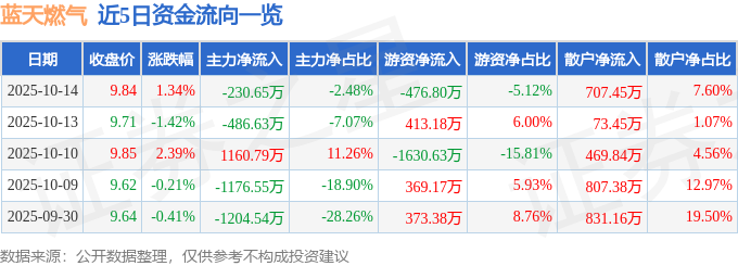 证券之星消息,截至2025年10月14日收盘,蓝天燃气(605368)报收于9.84元,上涨1.34%,换手率1.33%,成交量9.51万手,成交额9304.1万元。