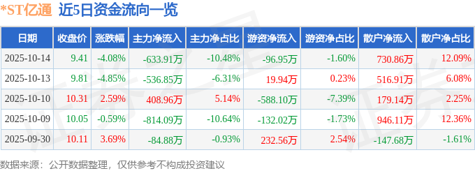 证券之星消息,截至2025年10月14日收盘,*ST亿通(300211)报收于9.41元,下跌4.08%,换手率2.11%,成交量6.28万手,成交额6046.97万元。