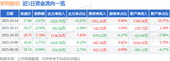 证券之星消息,截至2025年10月14日收盘,安利股份(300218)报收于17.6元,下跌3.67%,换手率4.47%,成交量9.67万手,成交额1.74亿元。