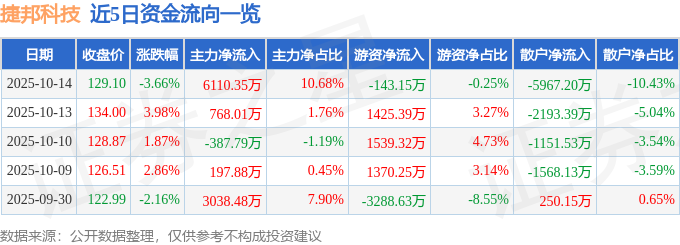 证券之星消息,截至2025年10月14日收盘,捷邦科技(301326)报收于129.1元,下跌3.66%,换手率16.11%,成交量4.4万手,成交额5.72亿元。