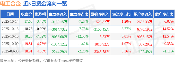 证券之星消息,截至2025年10月14日收盘,电工合金(300697)报收于17.63元,下跌3.45%,换手率7.33%,成交量24.29万手,成交额4.37亿元。
