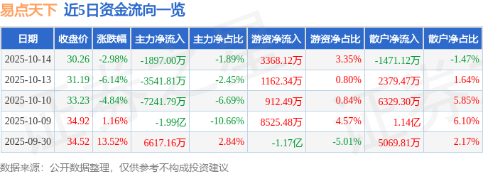 证券之星消息,截至2025年10月14日收盘,易点天下(301171)报收于30.26元,下跌2.98%,换手率8.73%,成交量32.59万手,成交额10.04亿元。