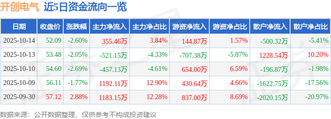 证券之星消息,截至2025年10月14日收盘,开创电气(301448)报收于52.09元,下跌2.6%,换手率3.63%,成交量1.74万手,成交额9252.24万元。