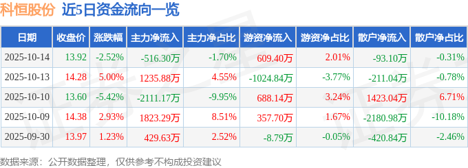证券之星消息,截至2025年10月14日收盘,科恒股份(300340)报收于13.92元,下跌2.52%,换手率7.7%,成交量21.06万手,成交额3.03亿元。