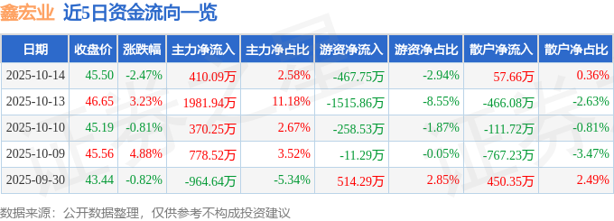 证券之星消息,截至2025年10月14日收盘,鑫宏业(301310)报收于45.5元,下跌2.47%,换手率6.88%,成交量3.46万手,成交额1.59亿元。