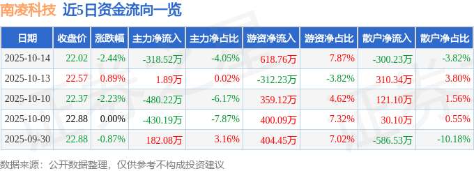 证券之星消息,截至2025年10月14日收盘,南凌科技(300921)报收于22.02元,下跌2.44%,换手率3.06%,成交量3.51万手,成交额7862.61万元。