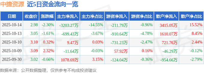 证券之星消息,截至2025年10月14日收盘,中捷资源(002021)报收于2.98元,下跌2.3%,换手率6.1%,成交量72.87万手,成交额2.2亿元。