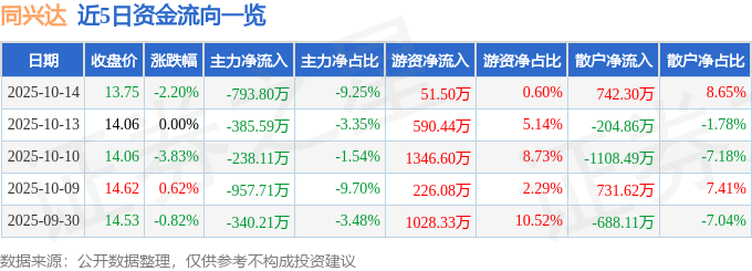 10月14日的资金流向数据方面,主力资金净流出793.8万元,占总成交额9.25%,游资资金净流入51.5万元,占总成交额0.6%,散户资金净流入742.3万元,占总成交额8.65%。