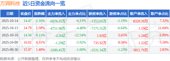 证券之星消息,截至2025年10月14日收盘,万润科技(002654)报收于14.47元,下跌2.16%,换手率9.0%,成交量76.03万手,成交额11.38亿元。