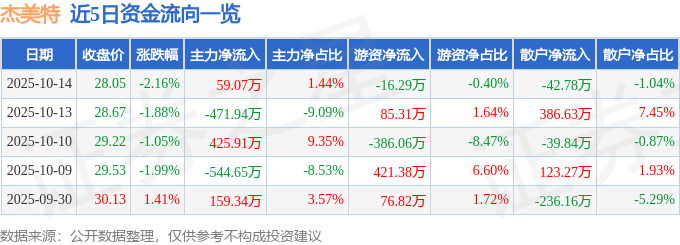 证券之星消息,截至2025年10月14日收盘,杰美特(300868)报收于28.05元,下跌2.16%,换手率1.8%,成交量1.45万手,成交额4100.86万元。
