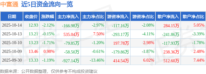 10月14日的资金流向数据方面,主力资金净流出166.98万元,占总成交额2.97%,游资资金净流出117.16万元,占总成交额2.08%,散户资金净流入284.15万元,占总成交额5.05%。
