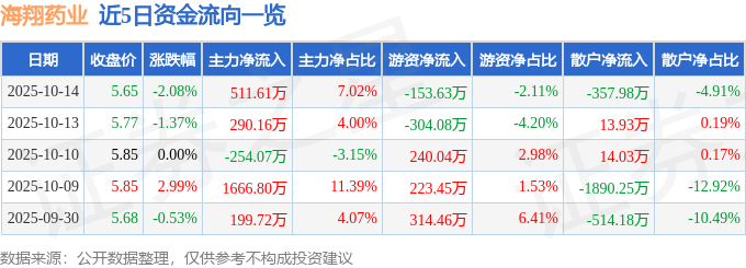 证券之星消息,截至2025年10月14日收盘,海翔药业(002099)报收于5.65元,下跌2.08%,换手率0.79%,成交量12.78万手,成交额7289.26万元。