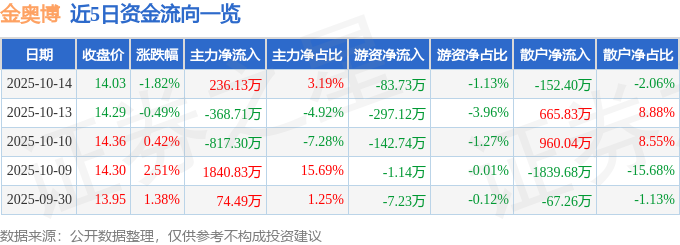 证券之星消息,截至2025年10月14日收盘,金奥博(002917)报收于14.03元,下跌1.82%,换手率2.0%,成交量5.21万手,成交额7392.14万元。