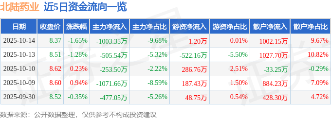 证券之星消息,截至2025年10月14日收盘,北陆药业(300016)报收于8.37元,下跌1.65%,换手率2.18%,成交量12.23万手,成交额1.04亿元。