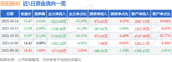 证券之星消息,截至2025年10月14日收盘,圣阳股份(002580)报收于13.47元,下跌1.61%,换手率3.12%,成交量14.1万手,成交额1.92亿元。