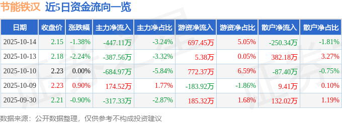 证券之星消息,截至2025年10月14日收盘,节能铁汉(300197)报收于2.15元,下跌1.38%,换手率2.14%,成交量63.38万手,成交额1.38亿元。