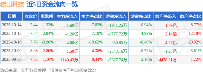 证券之星消息,截至2025年10月14日收盘,岩山科技(002195)报收于7.44元,下跌1.33%,换手率4.86%,成交量272.28万手,成交额20.44亿元。