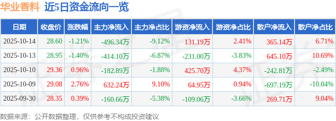 证券之星消息,截至2025年10月14日收盘,华业香料(300886)报收于28.6元,下跌1.21%,换手率4.33%,成交量1.89万手,成交额5439.55万元。