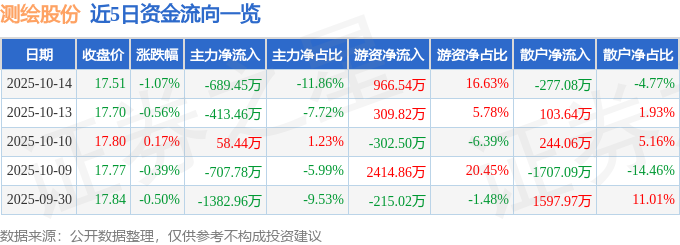 10月14日的资金流向数据方面,主力资金净流出689.45万元,占总成交额11.86%,游资资金净流入966.54万元,占总成交额16.63%,散户资金净流出277.08万元,占总成交额4.77%。