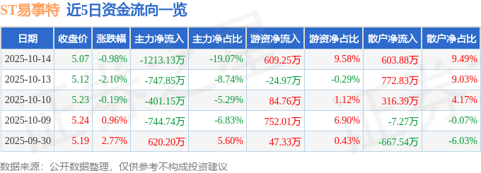 证券之星消息,截至2025年10月14日收盘,ST易事特(300376)报收于5.07元,下跌0.98%,换手率0.53%,成交量12.43万手,成交额6362.88万元。