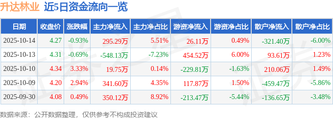 证券之星消息,截至2025年10月14日收盘,升达林业(002259)报收于4.27元,下跌0.93%,换手率1.66%,成交量12.51万手,成交额5354.31万元。