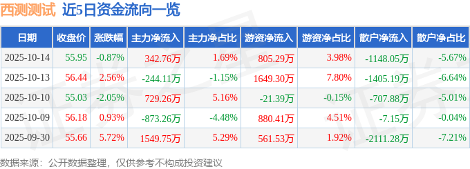 证券之星消息,截至2025年10月14日收盘,西测测试(301306)报收于55.95元,下跌0.87%,换手率6.12%,成交量3.57万手,成交额2.02亿元。